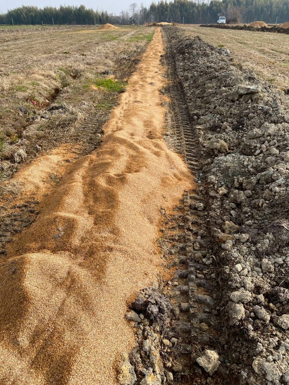この暗渠、設置にはパワーショベルや大型トラック等の重機作業が必要です。土をいったん掘り起こして暗渠を設置し、暗渠の細かい穴が土で目詰まりしないように、籾殻を暗渠にかぶせてから、土を戻して完了です。私たちは収穫時期にたくさん発生する籾殻を使いますが、貝殻などでも代用できるようです。